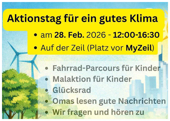 Samstag, 28. Februar 2026 | ab 12.00 Uhr | Auf der Zeil: Fahrrad-Parcours für Kinder · Malaktion für Kinder · Glücksrad · Omas lesen gute Nachrichten vor · Wir fragen und hören zu · Singen fürs Klima · Zukunftquiz: Wie heizt Frankfurt? · Bäume in Bewegung · Aerobic for Future · Zwergenaufstand · Küche-für-alle