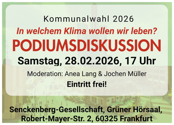 Unter dem Motto „In welchem Klima wollen wir leben?“ luden Radentscheid, Klimaentscheid und Scientists for Future Frankfurt am 28.2.2026 zu einer Podiumsdiskussion ein. Wer möchte, kann sich die Aufzeichnung auf Youtube ansehen. –> Weitere Infos …